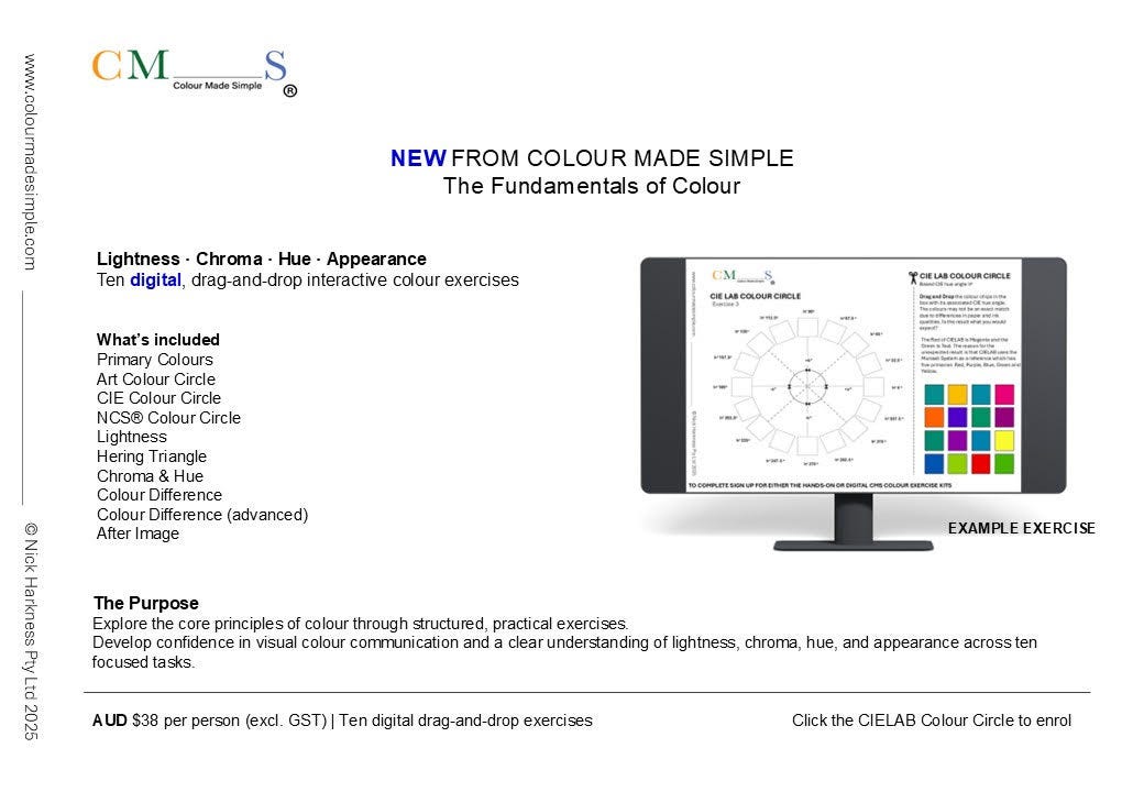 This new CMS set of Interactive colour exercises explore the core aspects of colour terminology. They enhance visual colour, communication and understanding of lightness, chroma, hue and appearance in just 10 practical tasks.