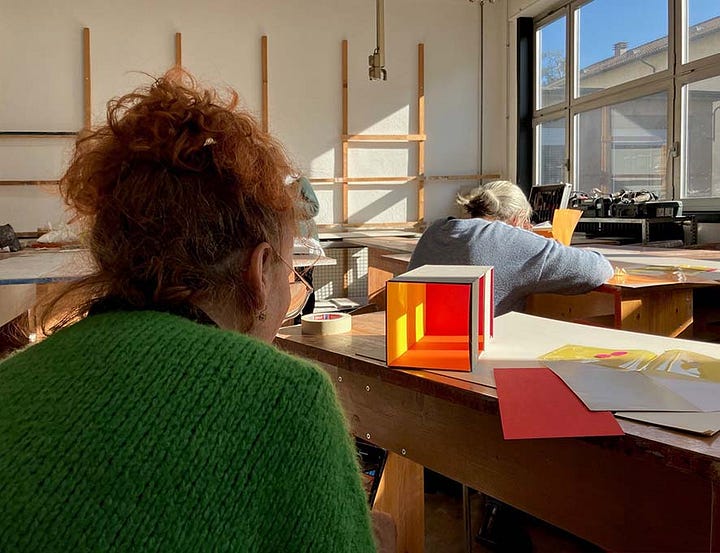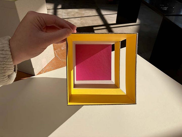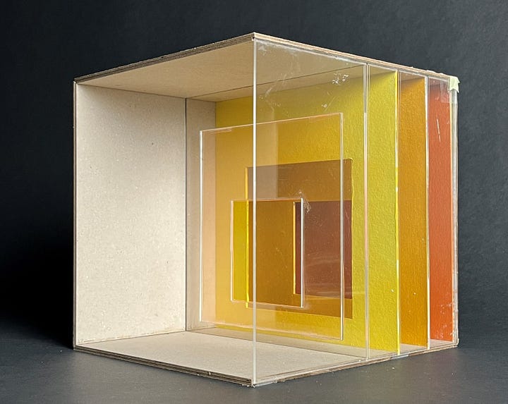 This hands-on workshop focuses on the transformation of Homages to the Square into homages to the cube, with alternative spatial solutions that refer to the same original. Participants bridge the gap between simulated depth and physical depth, experiencing firsthand how colour interactions evolve when liberated into three-dimensional space.