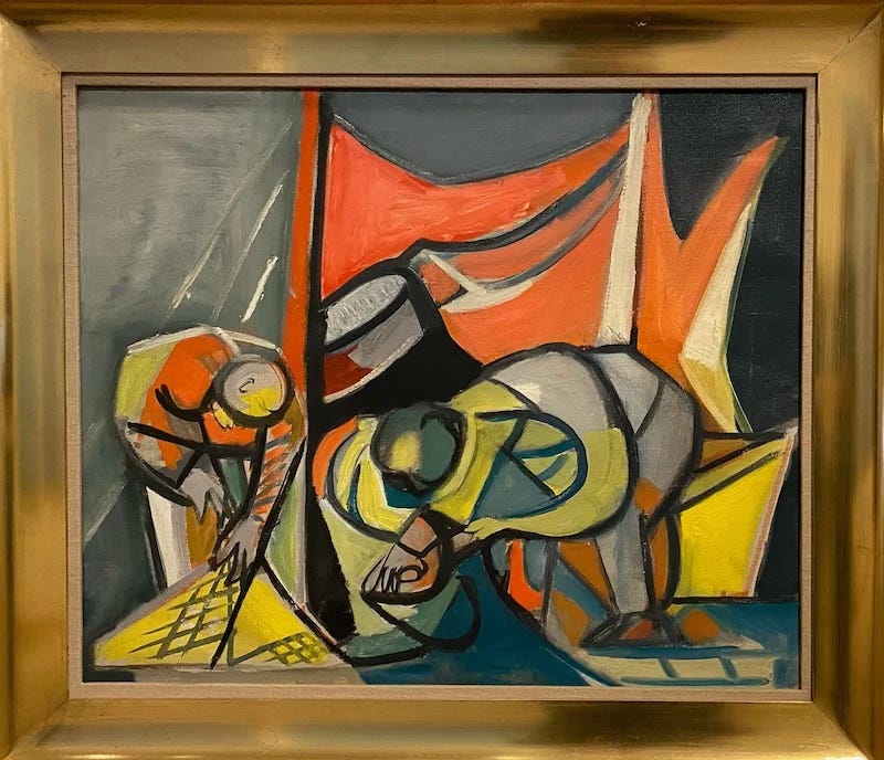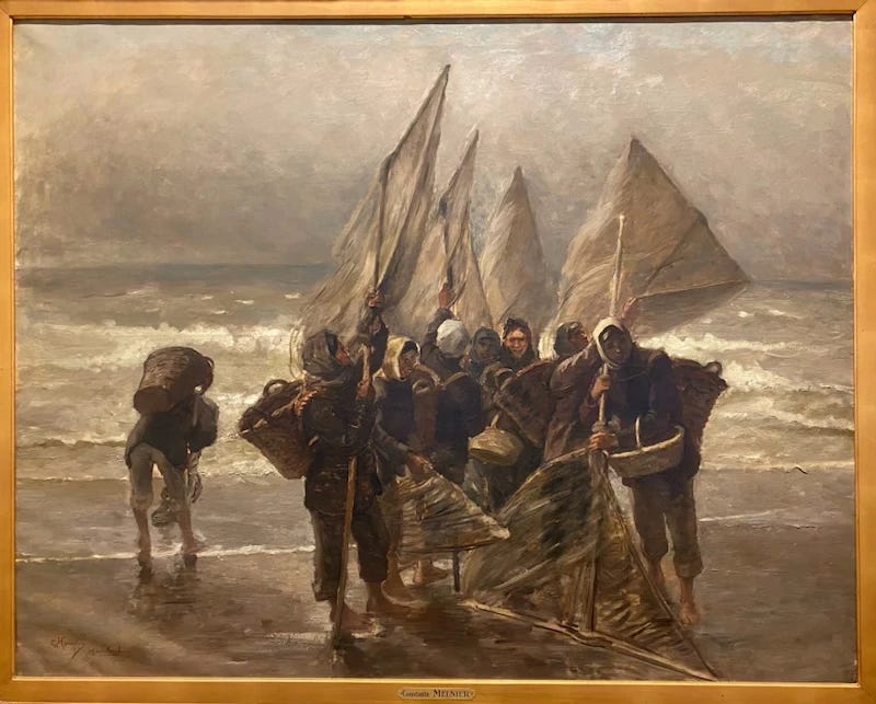 I know Constantin Meunier as a sculptor, but here I discovered him as a painter. Certainly, the somber tones of Shrimp Fisherwomen at Mariakerke are not joyous, but what a presence in these figures confronting the elements! With a few brushstrokes, they stand like sculptures. What a contrast with the equally interesting vision of Edouard Pignon! In a nearly abstract take on the same subject, he contrasts vivid orange and yellow against a gray background. Yet the gloomy weather is just as present.