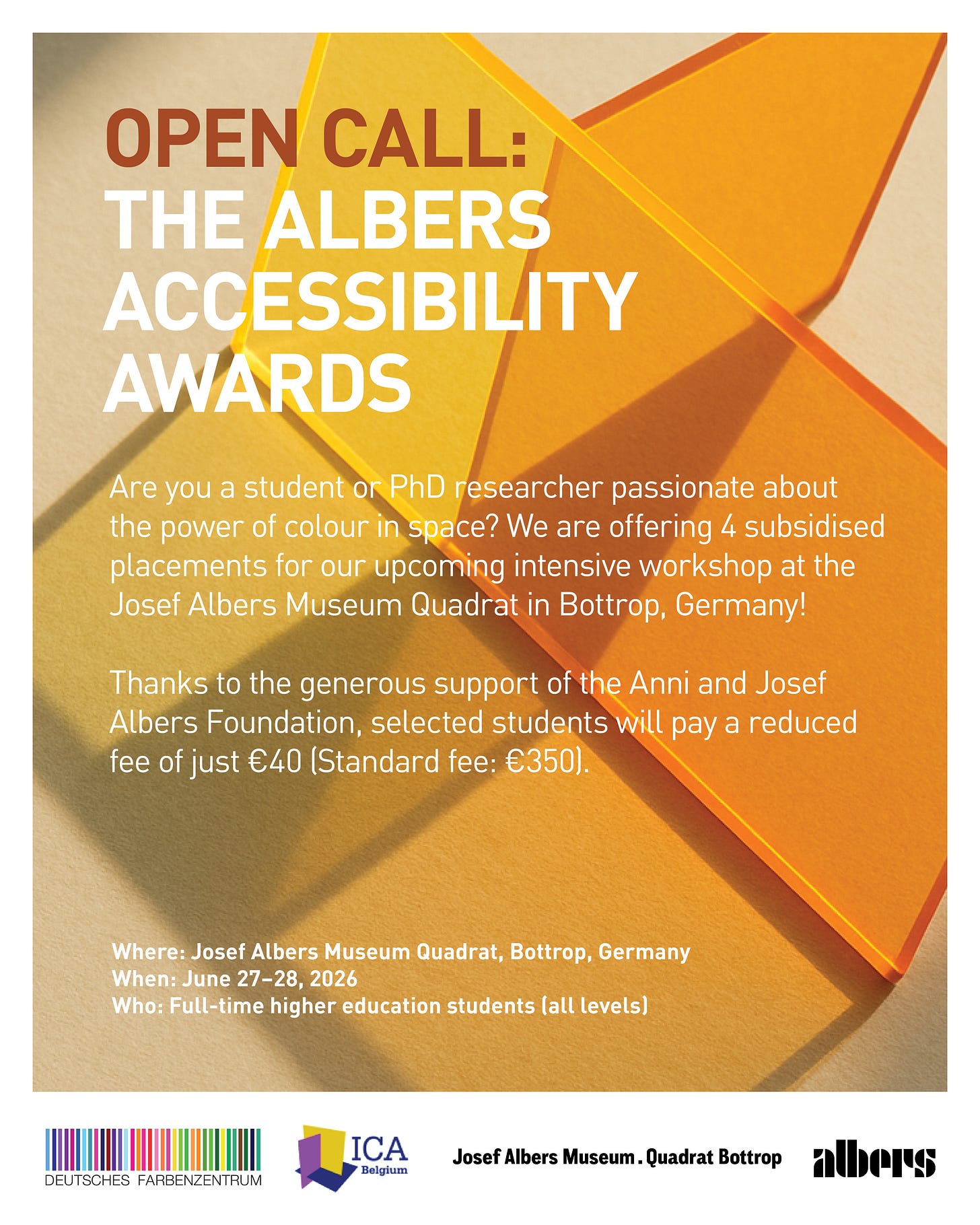 ICA-Belgium and the Deutsches Farbenzentrum (German Colour Association), with the generous support of the Anni and Josef Albers Foundation, are pleased to announce four subsidised placements for our upcoming intensive workshop, Interaction of Colour in Space, taking place at the Josef Albers Museum Quadrat, in Bottrop, Germany, June 27–28, 2026.